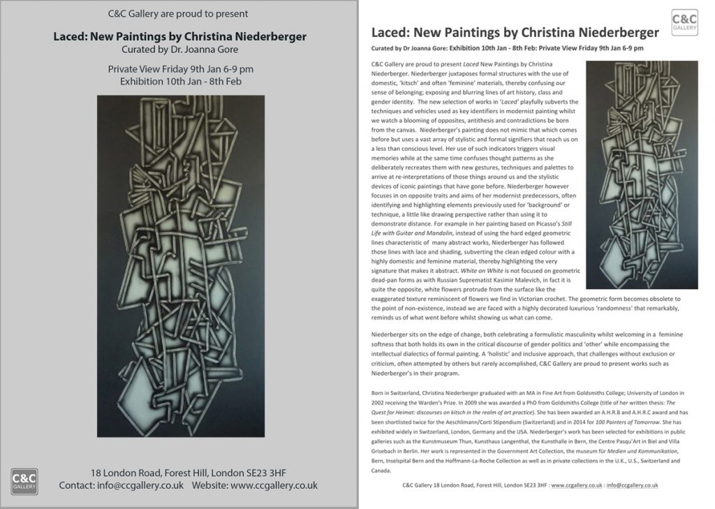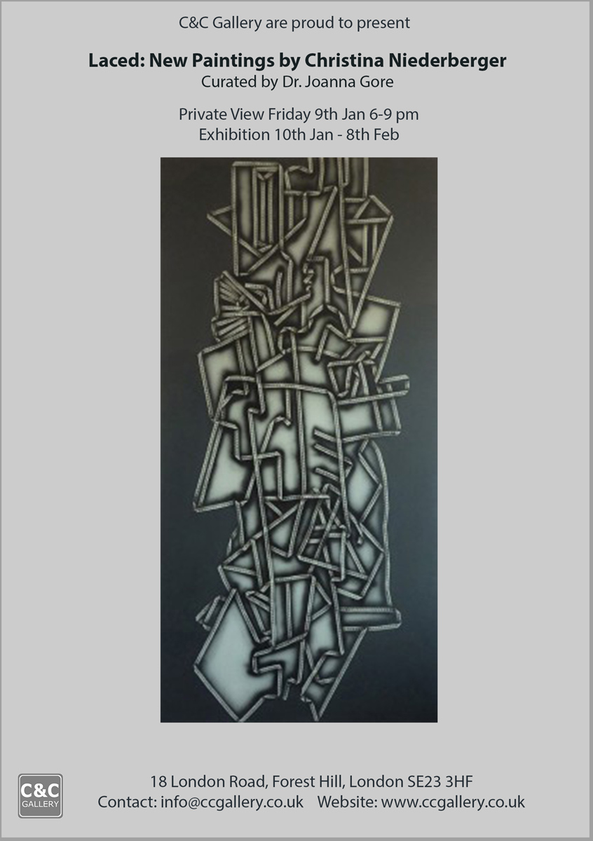LacedDecember 18, 2014 by admin Curated by Dr Joanna Gore: Exhibition 10th Jan – 8th Feb: Private View Friday 9th Jan 6-9 pm Links: C&C Gallery Press release (pdf)