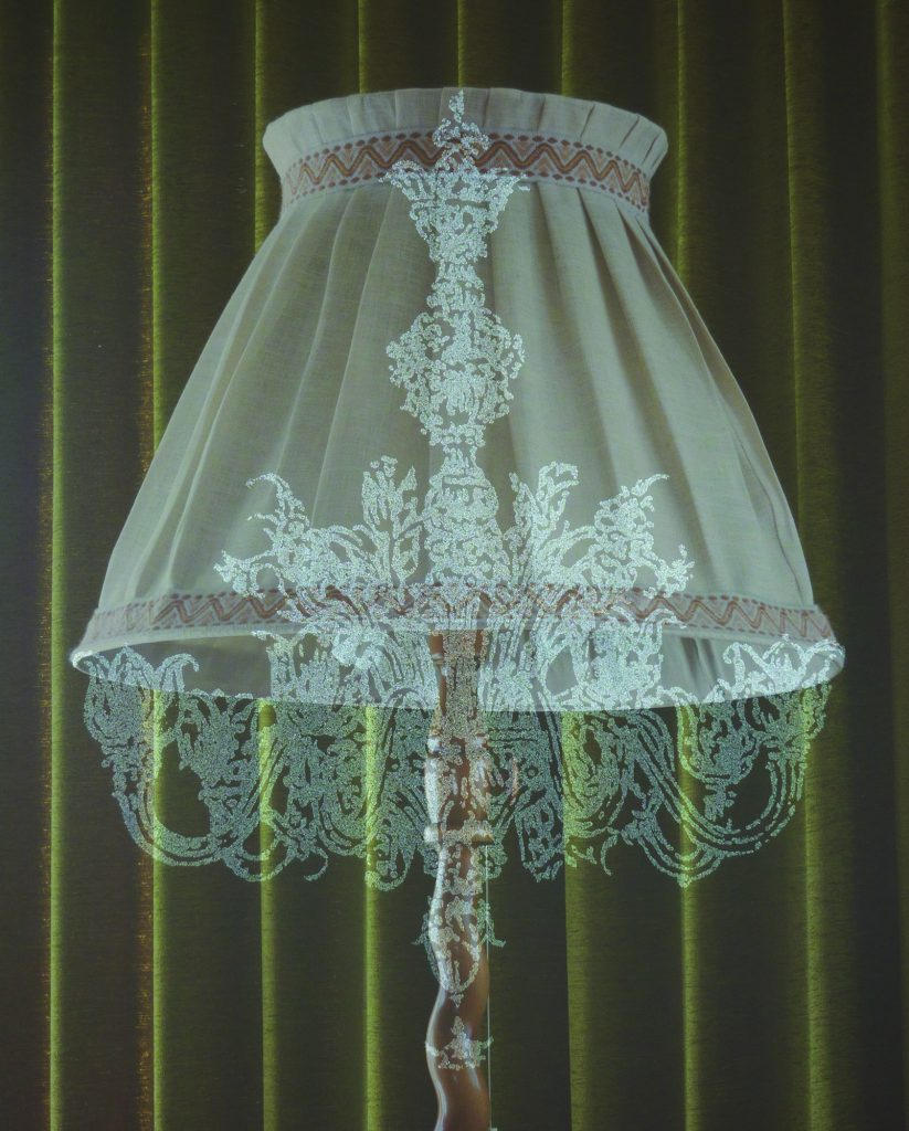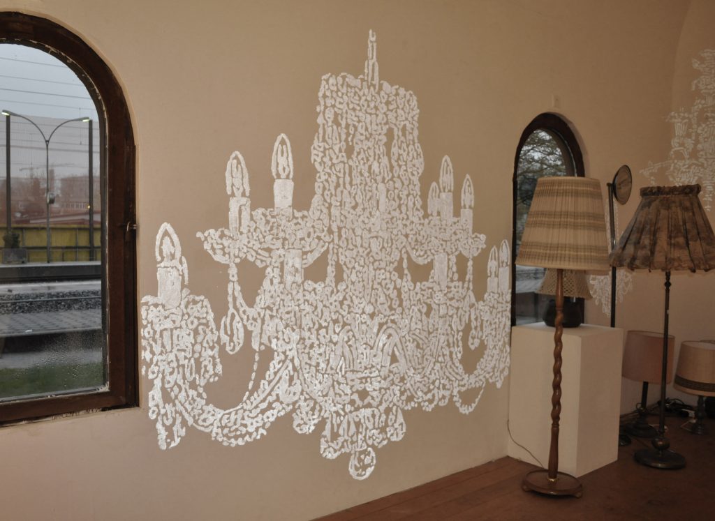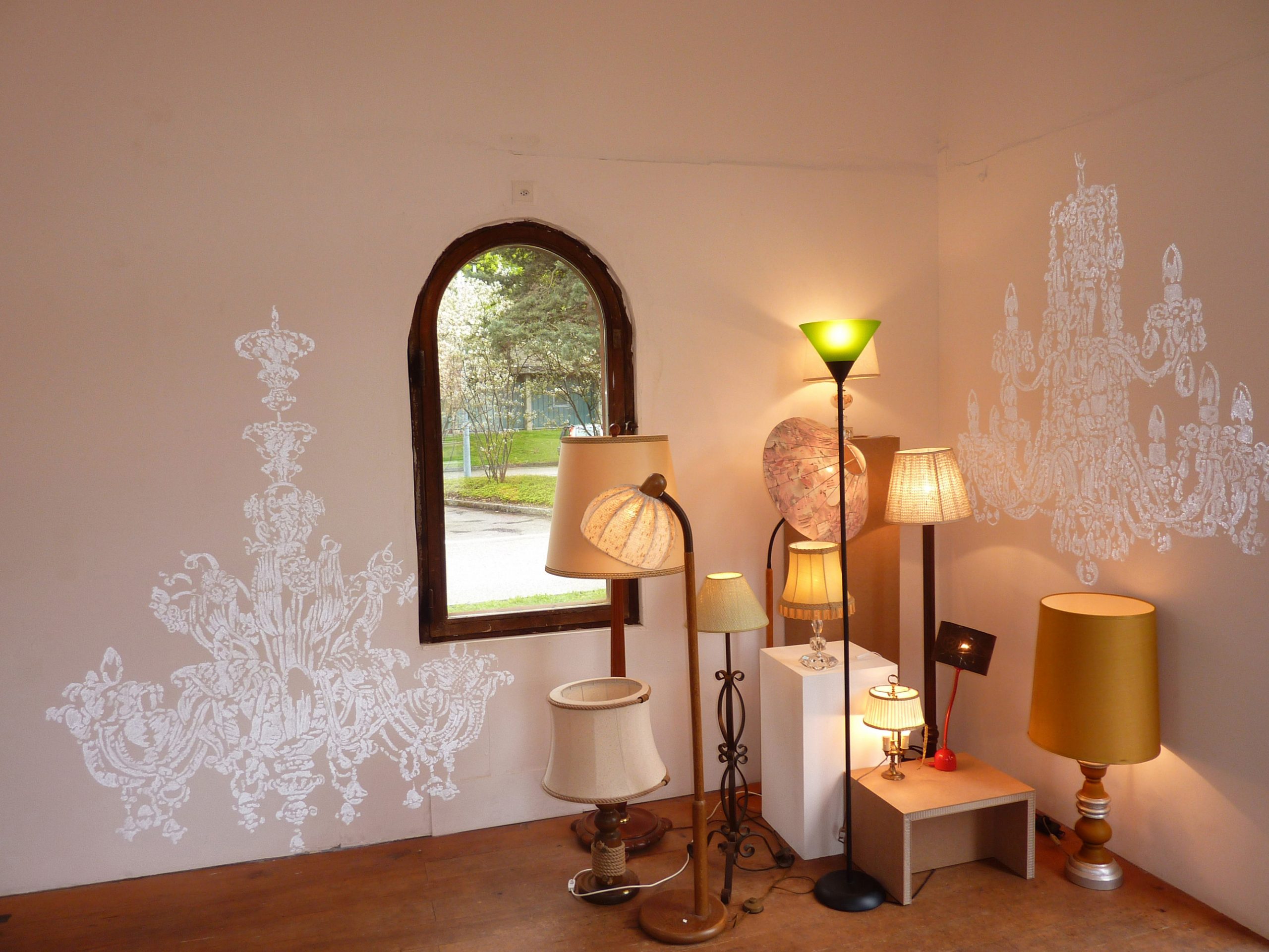 In 2013 I was invited to do a site-specific work in the CabaneB, in Bümpliz, Switzerland. Bümpliz is an area of Bern which is dominated by social housing and has an unusual high density of charity shops. My project for this space resulted in an installation of second hand lamps borrowed from these charity shops. These unwarranted lamps were juxtaposed with images of luxurious chandeliers painted directly onto the walls with light sensitive glass beads. Like ghostly alter egos, the chandeliers only came to shine as reflections in the light of the charity shop lamps which, having been made redundant, were brought back to life once more.