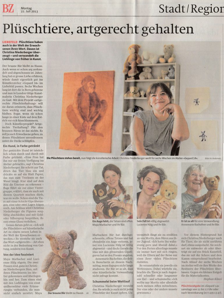 The title for this residency translates in English as ‘humanely soft toy animal keeping’ and plays on the double meaning of ‘artgerecht’ as something that is ‘right art’ but is also an expression for the correct way to keep an animal. The project I realized in Gepard14 evolved from the experience that, once we have reached adulthood, favourite cuddly toys from childhood are often condemned to an existence in limbo. No longer appropriate to share our bed but still too precious and emotionally charged to be thrown away, they mostly end up in a box on the attic.